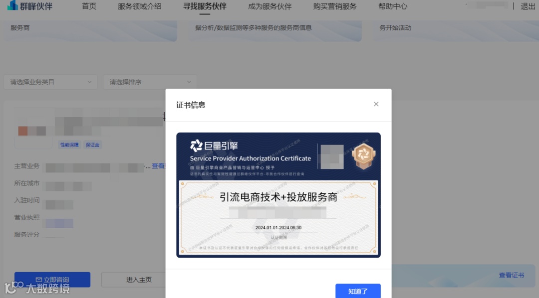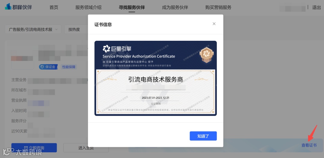 方法一:搜索巨量引擎群峰服务市场官网,点击电商技术工具,即可看到服务商发布的CID商品,点开商品详情页,点击下方 查看证书 按钮,即可查看认证证书