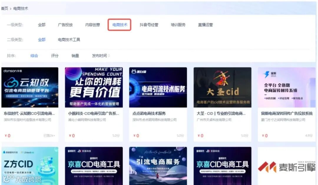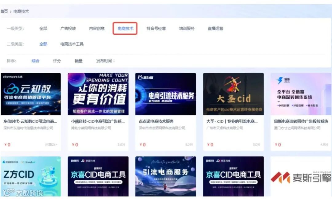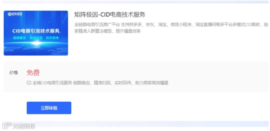搜索巨量引擎群峰服务市场官网,点击电商技术工具,即可看到服务商发布的CID商品→点开商品详情→点击立即体验,即可立即联系服务商