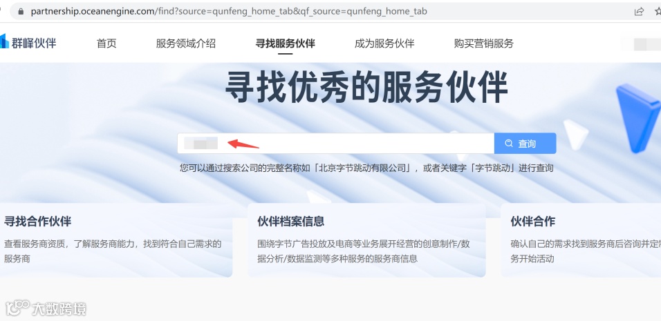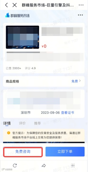 还可以通过手机端搜索群峰服务市场官网,点击巨量广告工具-电商技术类目,进入到服务商CID商品页面后,点开详情→点击立即咨询,即与服务商进行沟通