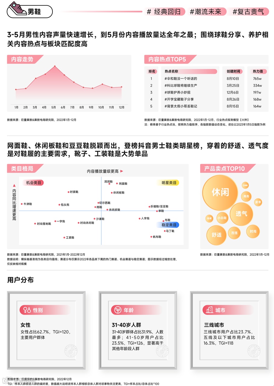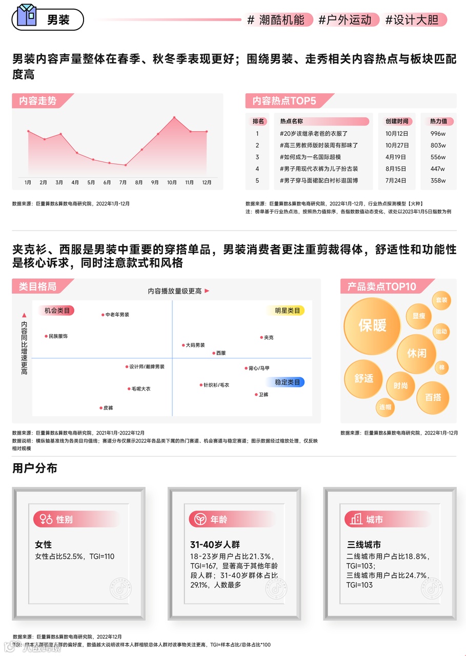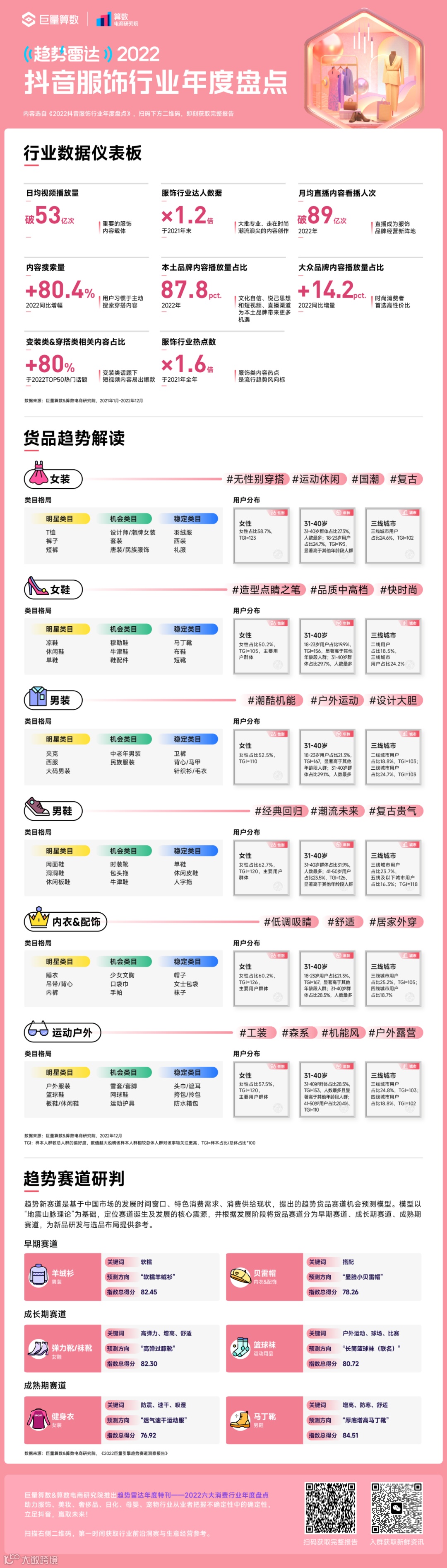 2022年的抖音平台服饰板块出现了众多令行业欣喜的现象。众多服装品牌在抖音找到了发展机遇,在618、双十一等营销节点实现GMV和品牌声量的爆发;大量服饰板块产品在疫情后时代惊喜地找到了匹配的需求人群。从服饰行业品类来看,2022年,女装、女鞋、男装、男鞋、内衣&配饰和运动户外六大品类表现亮眼,以流行趋势为方向,各品类围绕「复古甜辣」、「精致奢华」、「运动休闲」、「中性利落」、「城市机能」等方向诞生出一件又一件的趋势商品和爆品。平台从用户内容兴趣出发,捕捉时尚内容热点,发布了春夏和秋冬两季趋势洞察,帮助品牌通过设计风格、用料设计、穿搭组合带来更符合消费者兴趣的时尚演绎。
