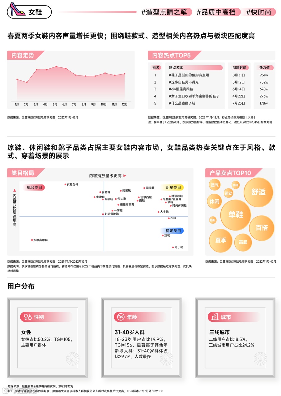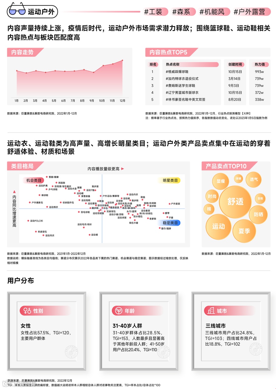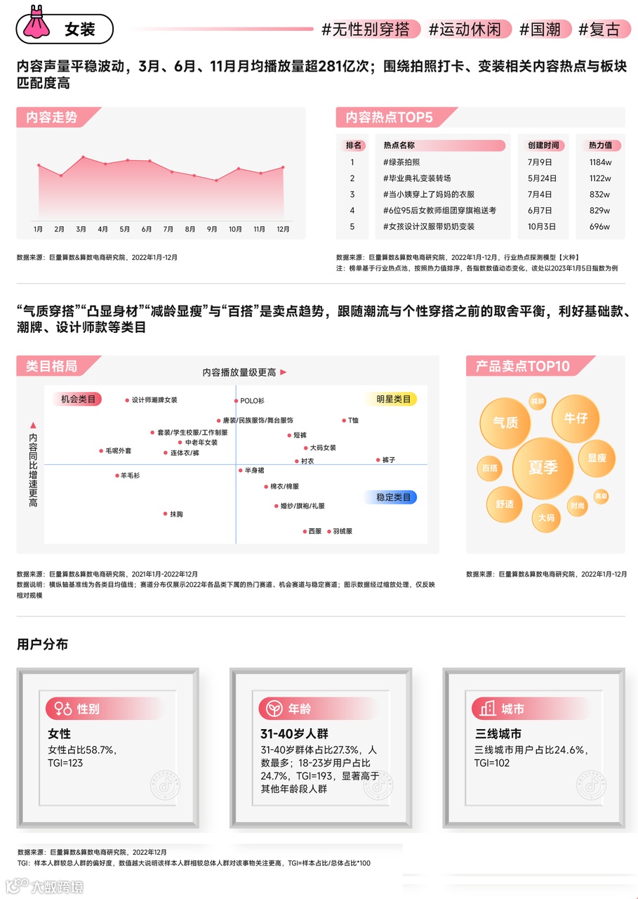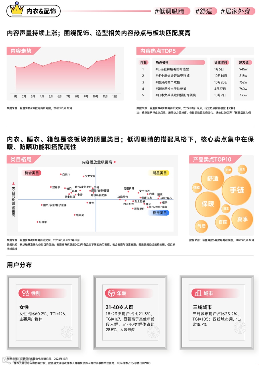2022年的抖音平台服饰板块出现了众多令行业欣喜的现象。众多服装品牌在抖音找到了发展机遇,在618、双十一等营销节点实现GMV和品牌声量的爆发;大量服饰板块产品在疫情后时代惊喜地找到了匹配的需求人群。从服饰行业品类来看,2022年,女装、女鞋、男装、男鞋、内衣&配饰和运动户外六大品类表现亮眼,以流行趋势为方向,各品类围绕「复古甜辣」、「精致奢华」、「运动休闲」、「中性利落」、「城市机能」等方向诞生出一件又一件的趋势商品和爆品。平台从用户内容兴趣出发,捕捉时尚内容热点,发布了春夏和秋冬两季趋势洞察,帮助品牌通过设计风格、用料设计、穿搭组合带来更符合消费者兴趣的时尚演绎。