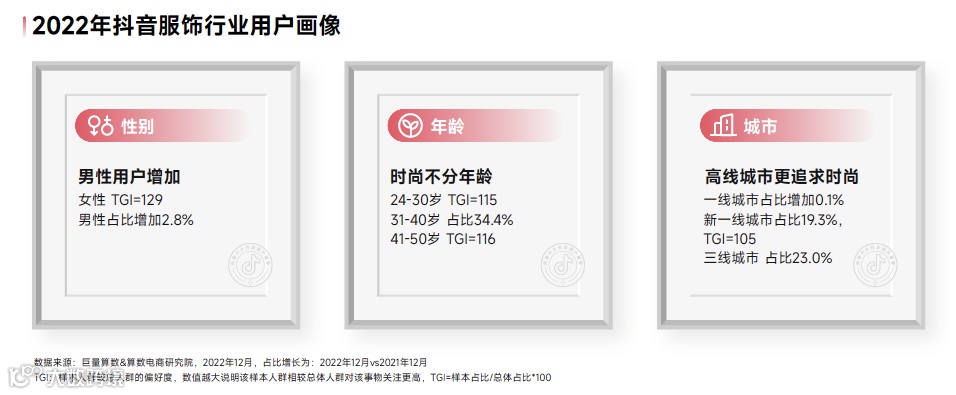 女性是服饰&时尚内容领域最主要的目标受体群体,但男性在服饰领域的影响力也正在提升。随着社会观念的转变,男性对外表的关注度提升,各大时尚品牌在男性鞋服包领域发力,男性兴趣用户占比增加。时尚不分年龄,31-40岁群体人数最多,占比34.4%,24-30岁群体TGI=115,41-50岁群体TGI=116,每个年龄段在抖音都拥有穿搭热情并尽情展现自己。此外,高线城市相对更追求时尚,三线城市占比最多23.0%,城市分布较平均。