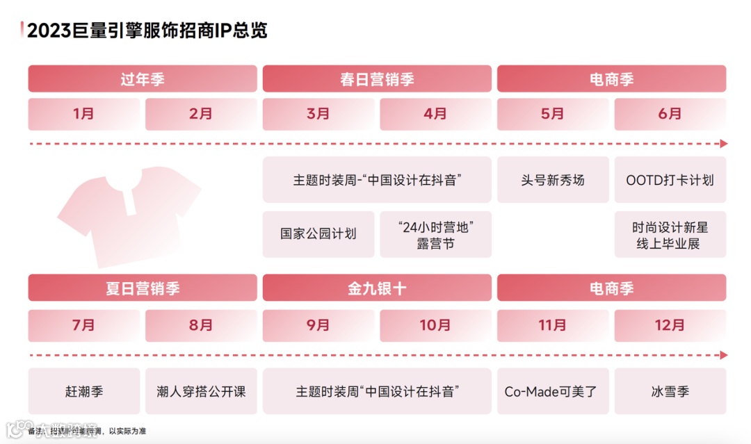 新年新气象,对于去年增长乏力的服饰行业来说,2023年的生意拐点更是珍贵。服饰品牌要想玩转行业营销,破解流量焦虑,就得抓住机会。在2023年巨量引擎服饰行业IP活动规划中,有趋势热门营销话题如露营、时装周、秀场、冰雪季等,着眼中国时尚设计领域,推出主题拍摄、综艺、快闪、派对等专题内容与营销事件,挖掘更多内容与商业合作模式。