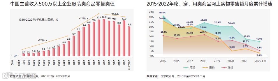 中国服饰内需市场近20年高速增长,是全球最大单一鞋服消费市场,占比达到四分之一。但过去一年,不少服装企业在市场需求、原料供给等多方不稳定因素的影响下,运营风险增大,企业经营面临巨大挑战。国家统计局数据,2022年1-11月,我国限额以上单位服装类商品零售额累计8294.6亿元,同比下降6.9%。受疫情影响,服饰零售市场线下终端销售受阻,线上受物流配送影响,2022年服饰消费零售额呈现线上线下均下降趋势。