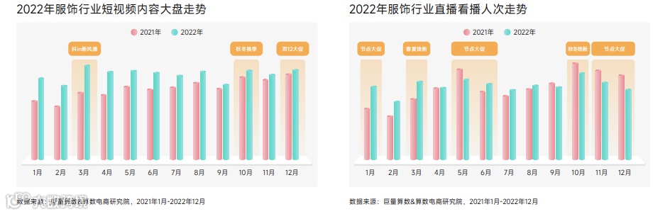 抖音短视频、直播受到商家、达人和消费者的热烈关注。优质短视频、趣味直播激发用户消费需求,“人货场合一”的平台生态又将用户搜索、种草和消费紧密连接。2022年抖音平台内,服饰鞋包行业受换季上新影响较大,春夏、秋冬两季节点是流量爆发时机,全年内容短视频播放量增长19.7%,日均播放量破53亿次,再创新高。服饰直播内容看播人次全年平稳波动,平均每月看播人次近89亿次,电商节点大促和季节交错时节直播观看人次数据出现爆发。