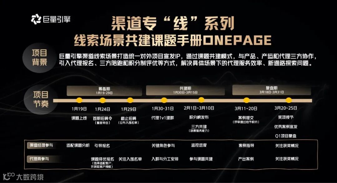 巨量引擎渠道线索场景打造统一对外项目宣发IP,2024年度通过课题共建模式,与产品、产运和代理三方协作,引入代理报名、渠道反选、三方陪跑和积分制评优等方式,解决具体场景下的代理服务效率、新通路探索问题。
