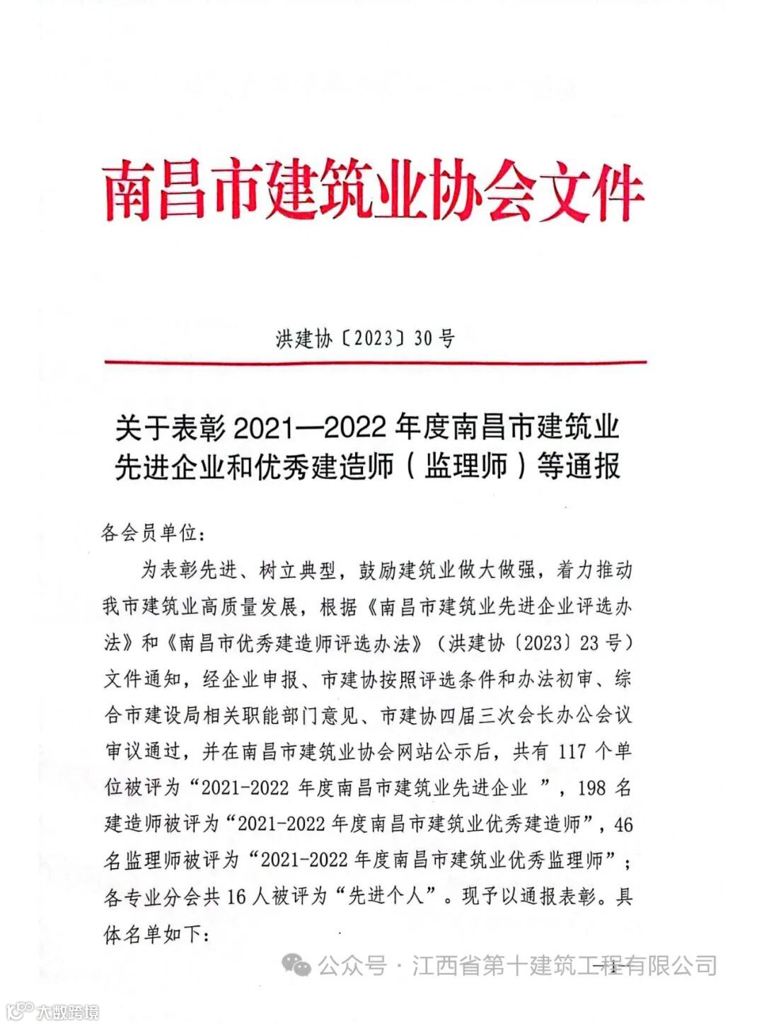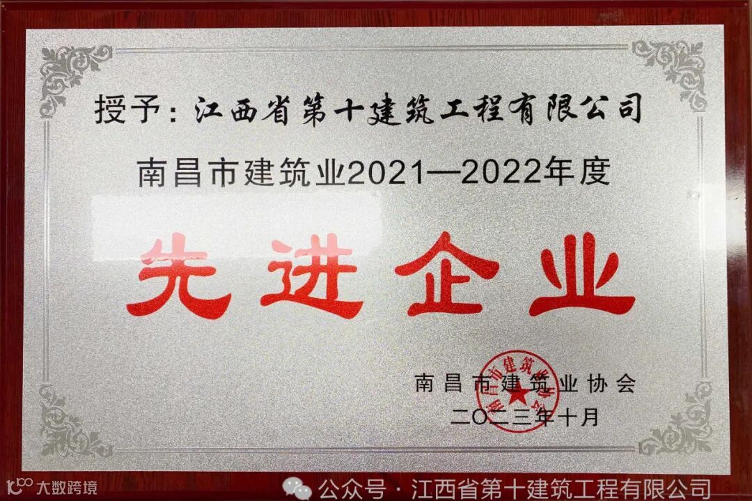 1月9日,南昌市建筑业协会第四届理事会第二次会议暨2023年度表彰大会在南昌市江西饭店隆重召开。此次大会通报了南昌市建筑业2021-2022年度“先进企业”、“优秀建造师”、“优秀监理师”、“先进个人”等各类奖项入选名单,江西省第十建筑工程有限公司荣获南昌市建筑业2021-2022年度“先进企业”荣誉称号。