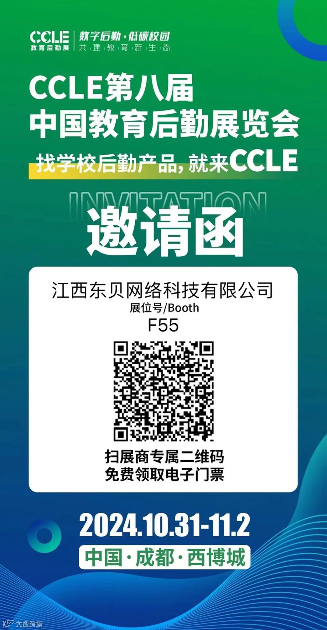 为积极响应国家教育数字化战略行动,进一步展示现代数字技术、智能设施设备在校园建设及后勤管理、服务等各个环节的创新应用,探讨人工智能时代未来后勤面临的机遇与挑战,持续推动教育后勤领域的创新与发展,第八届中国教育后勤展览会于2024年10月31日-11月2日在成都西博城隆重举办,东贝食安受邀出席此次展会。
