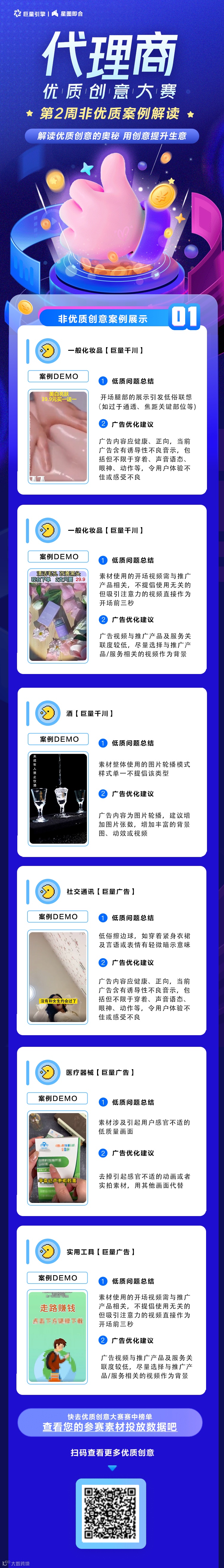 本周重点解读一般化妆品、酒、社交通讯、医疗器械、实用工具等行业出现的高频低质视频,通过对非优质内容的拆解分析,让同类问题得到改善,解读创意的奥秘,用创意提升生意。