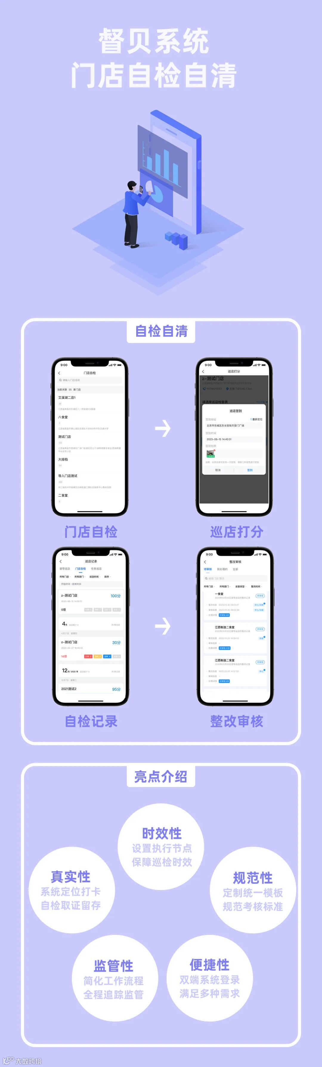 督贝系统门店自检功能则可以通过现场定位打卡,填写签到时间,要求巡检人员现场拍照上传,保证门店自检真实性。