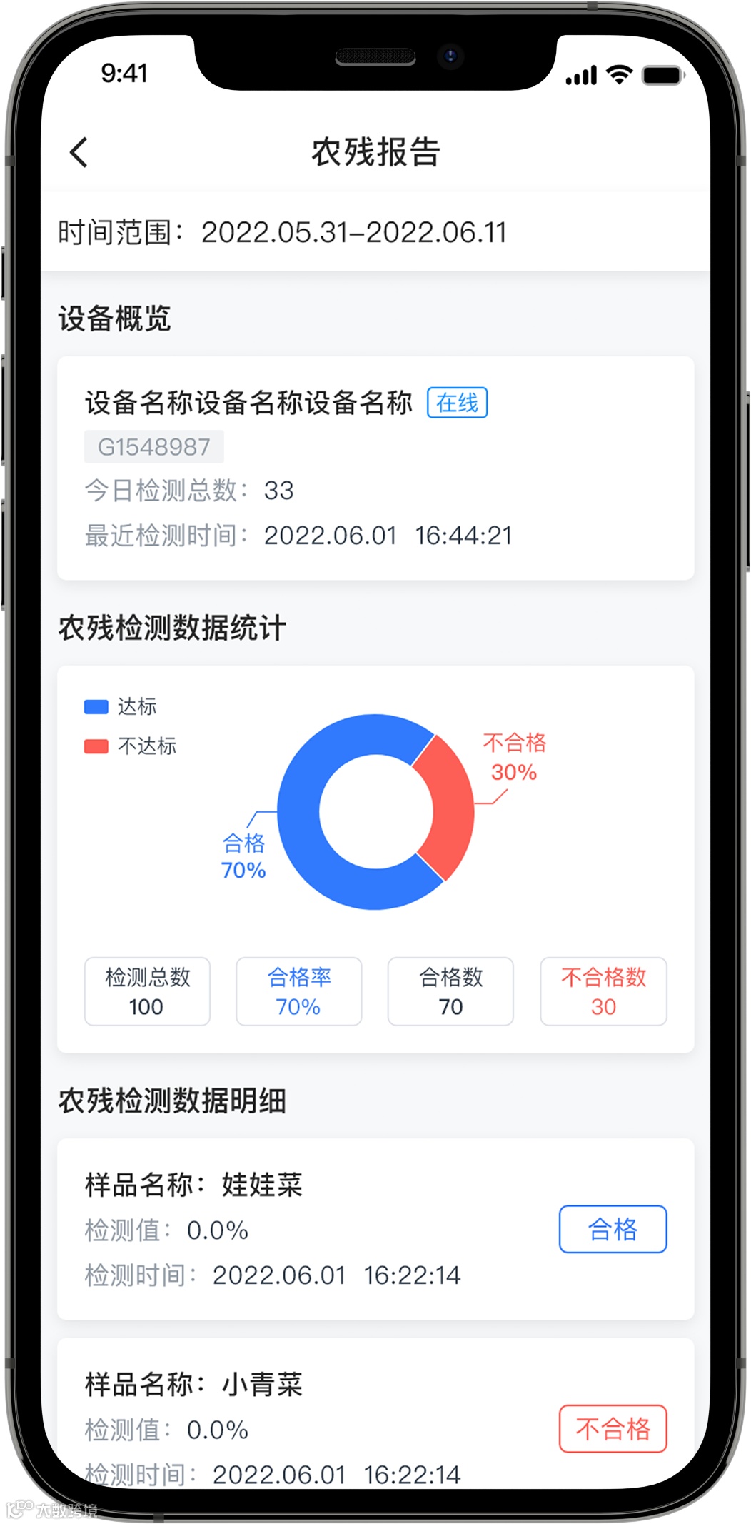 台账报表统计管理可通过智慧门店APP实时查看门店农残检测的菜品,检测数值,检测结果、检测时间,并通过扇形比例图查看企业旗下全部门店菜品农残合格与不合格占比,便于企业门店管理参考分析。