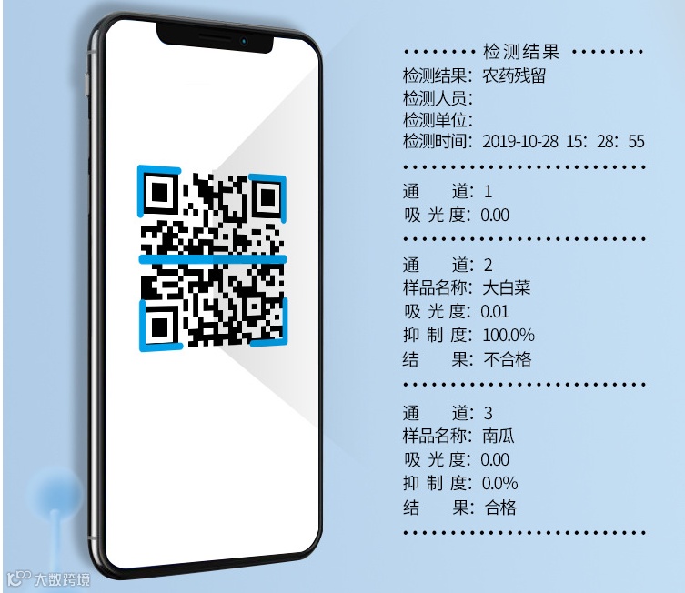 东贝食安检测试剂使用可含有多种通道同时检测农残含量,独立工作互不干扰,循环检测,即放即检,检测数据可自动生成二维码,手机扫一扫可同步查看。