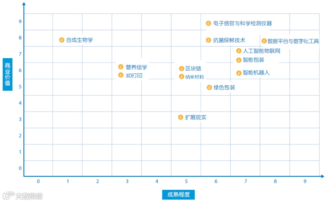 13项食品行业创新技术的成熟程度与商业价值矩阵