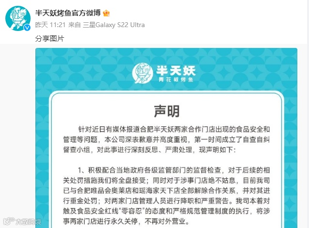 针对“安徽合肥两家门店出现食品安全问题”一事,半天妖烤鱼官方微博发布声明:我司本着对触及食品安全红线“零容忍”的态度和严格规范管理制度的执行,将涉事两家门店进行永久关停,不再对外营业。