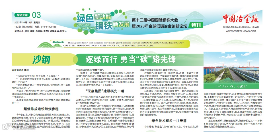 第十二届中国国际钢铁大会暨2023年全球低碳冶金创新论坛召开之际,中国冶金报刊发文章《沙钢:逐绿而行 勇当“碳”路先锋》,重点报道了沙钢生态、绿色、低碳发展实践,向全行业乃至世界展现了沙钢高质量发展的绿色担当。