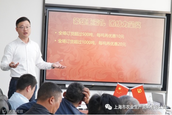 随后,氮肥部产品经理朱冠晨为客户详细介绍了现场订货政策,价格体系,优惠条件等,为客户做出了全年货源稳定供应,严格的独家代理区域保护制度,优质的服务推广支持的三大承诺。最后上海农资副总经理窦鉷发言表示:感谢各大经销商对上海农资的大力支持,海蔚施-海藻富锌硼尿素的推出是我司差异化尿素的新起点,也是我司与经销商合作共赢的新契机,后续我司还会继续推出一系列差异化尿素的中高端产品,满足不同需求。