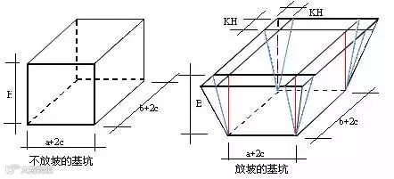 根据土的性质、开挖深度以及施工方法确定土壁是否放坡。放坡的宽度根据放坡系数计算,即KH。