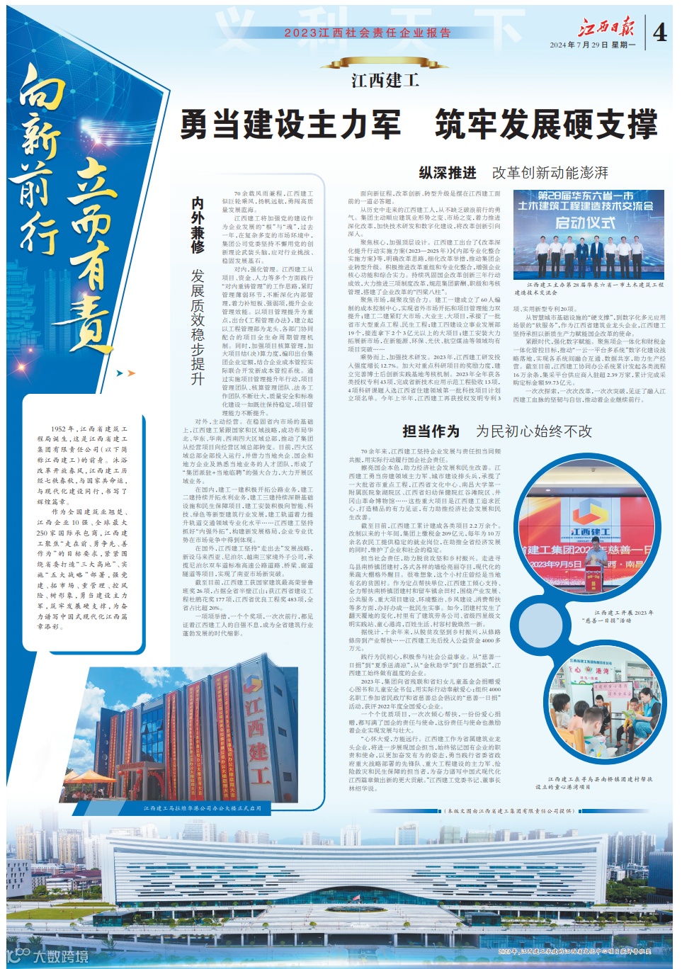 70余年来,江西建工坚持企业发展与责任担当同频共振,用实际行动履行国企社会责任。