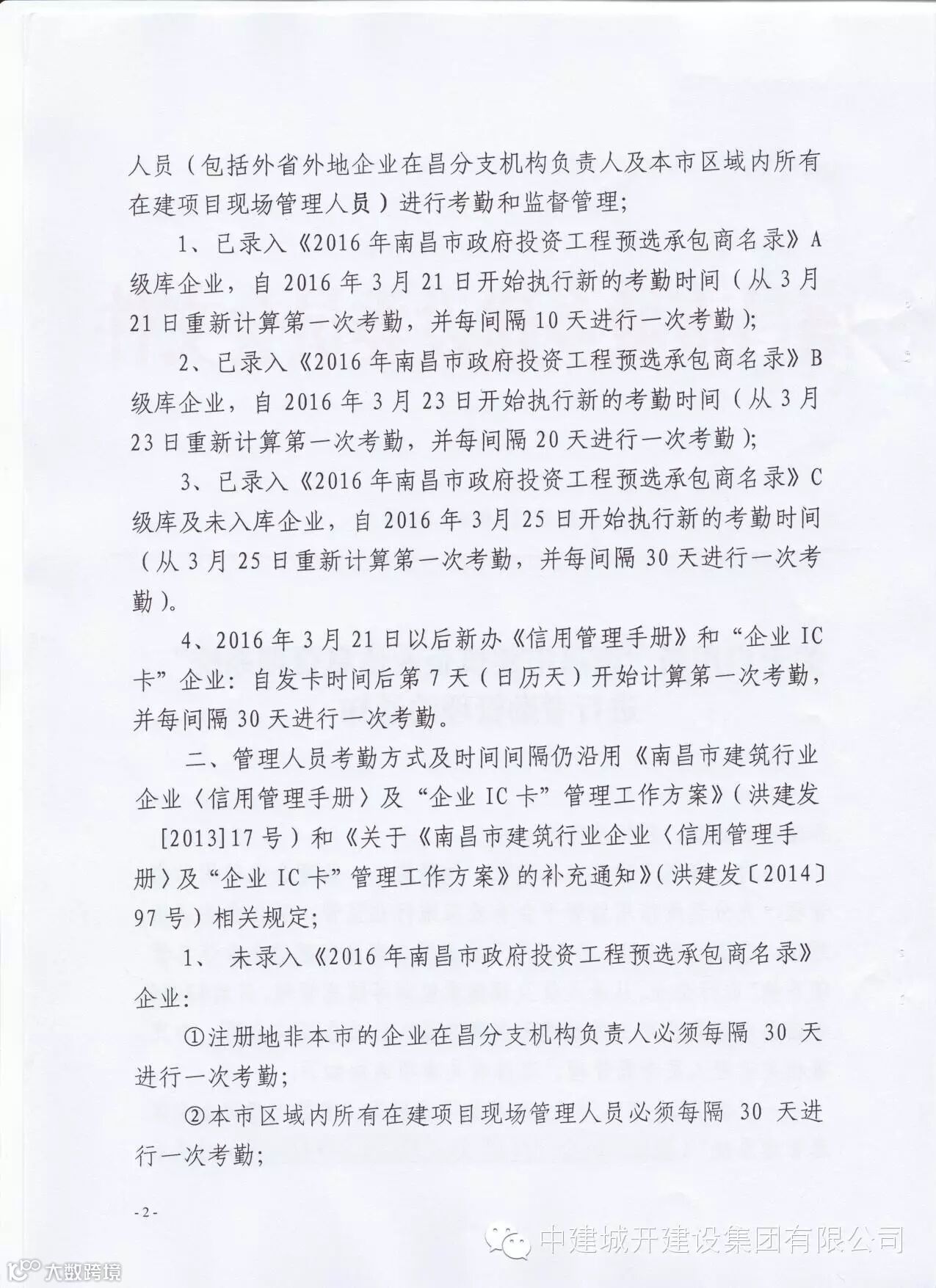 2、已录入《2016年南昌市政府投资工程预选承包商名录》B级库企业,自2016年3月23日开始执行新的考勤时间(从3月23日重新计算第一次考勤,并每间隔20天进行一次考勤);