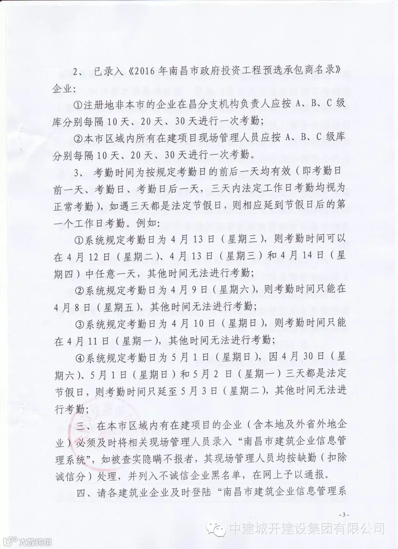 3、已录入《2016年南昌市政府投资工程预选承包商名录》C级库及未入库企业,自2016年3月25日开始执行新的考勤时间(从3月25日重新计算第一次考勤,并每间隔30天进行一次考勤)。