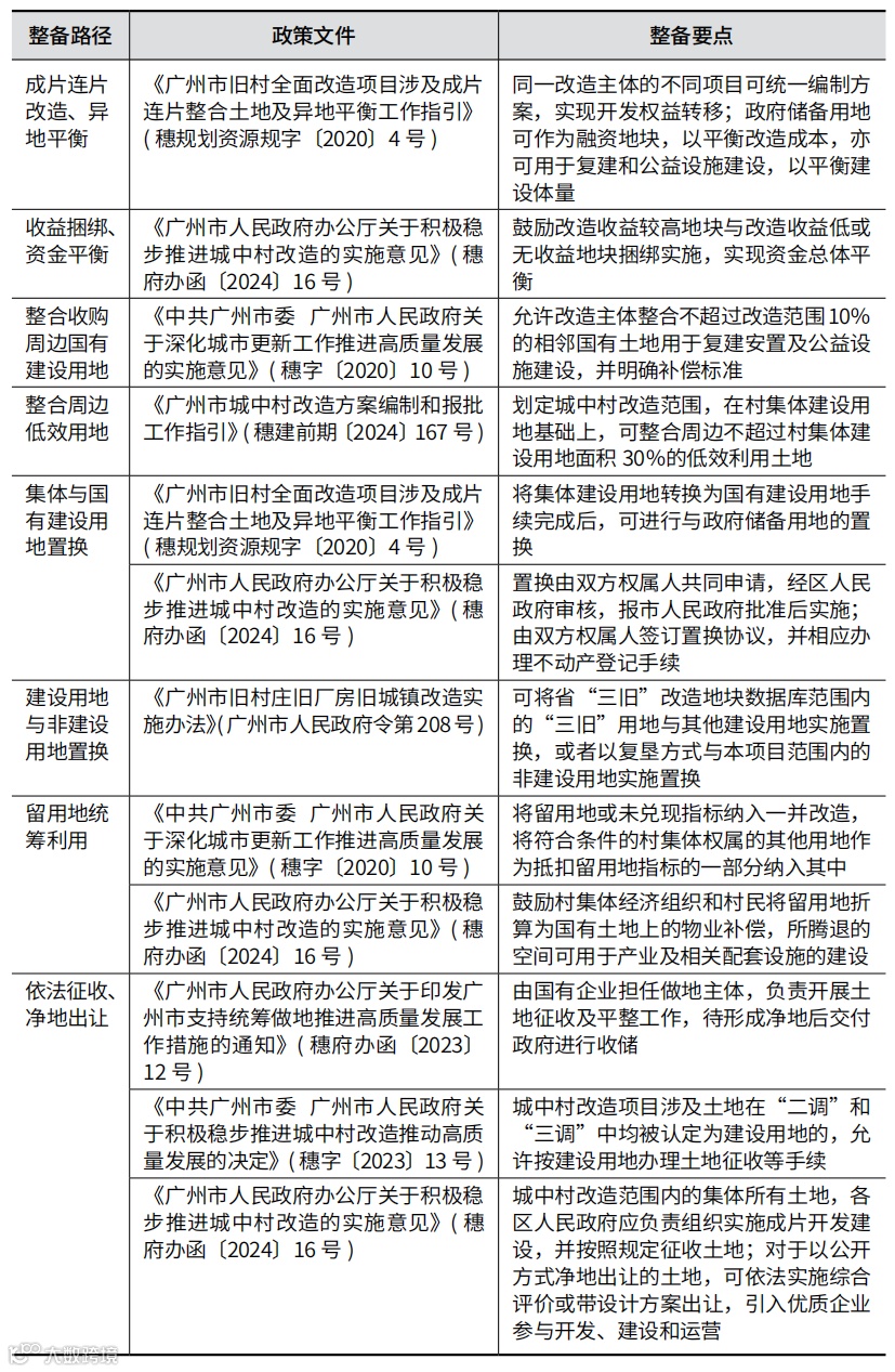 从顶层设计看,广州市城中村改造尚未正式明确土地整备制度,系统的城中村土地业务全链条政策体系也尚未建立。土地整备更多是以“用地整合”“土地置换”“拆旧复垦”等词条出现在城中村改造的相关政策条文中,在深度上仅停留在原则性指导意见层面,导致城中村改造项目的土地整备路径并不清晰。
