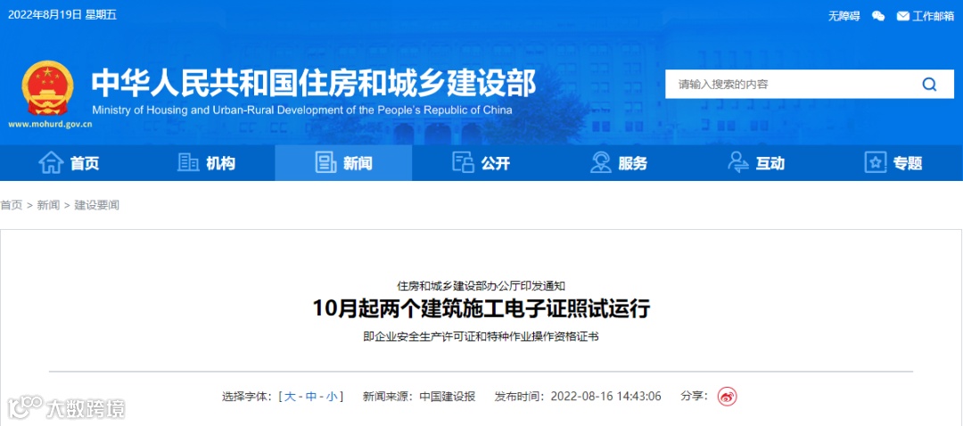 住房和城乡建设部办公厅近日印发通知,自2022年10月1日起,开展建筑施工企业安全生产许可证和建筑施工特种作业操作资格证书电子证照(以下简称“电子证照”)试运行。