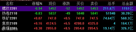 昨日冲高未果后,夜盘成材品种全部低开。日盘,期货市场震荡加剧,多品种盘中翻绿,尤其原料端多空拉锯非常明显,最终勉强收涨,成材端整体则偃旗息鼓,阴线收尾。螺纹期货最低触及5400元,热卷期货则一度击穿5700元大关。