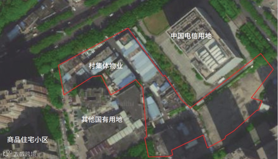 图2 广州市某村集体物业用地与周边国有土地布局卫星图