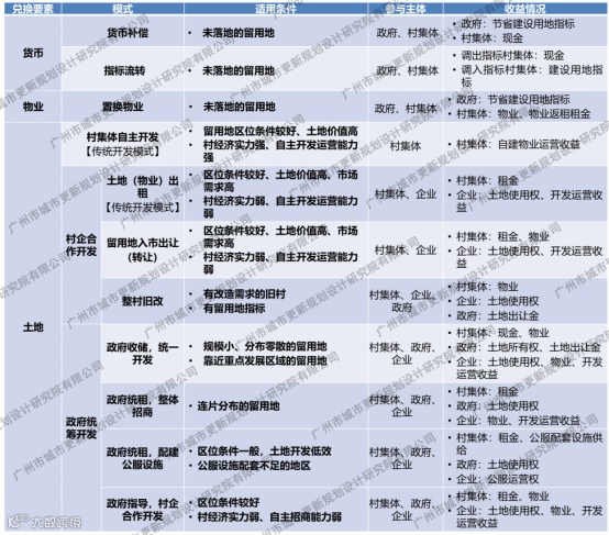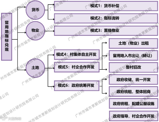 在留用地开发探索的实践中,按留用地指标兑换要素有货币、物业、土地,结合具体的操作路径可以分为六种开发模式:货币补偿、指标流转、置换物业、村集体自主开发、村企自主开发、政府统筹开发。本文将重点结合广州的留用地开发案例对留用地开发模式进行介绍。