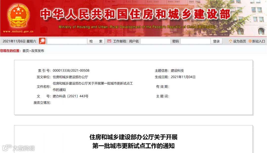 2021年11月4日,住房和城乡建设部办公厅印发《关于开展第一批城市更新试点工作的通知》(建办科函〔2021〕443号),决定在全国21个城市(区)开展第一批城市更新试点工作。