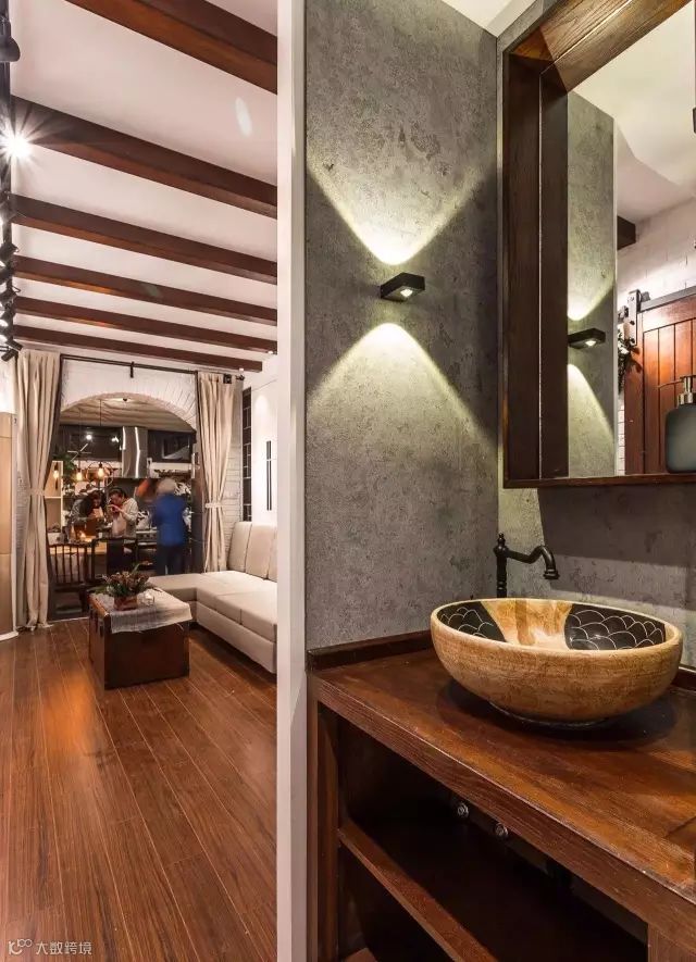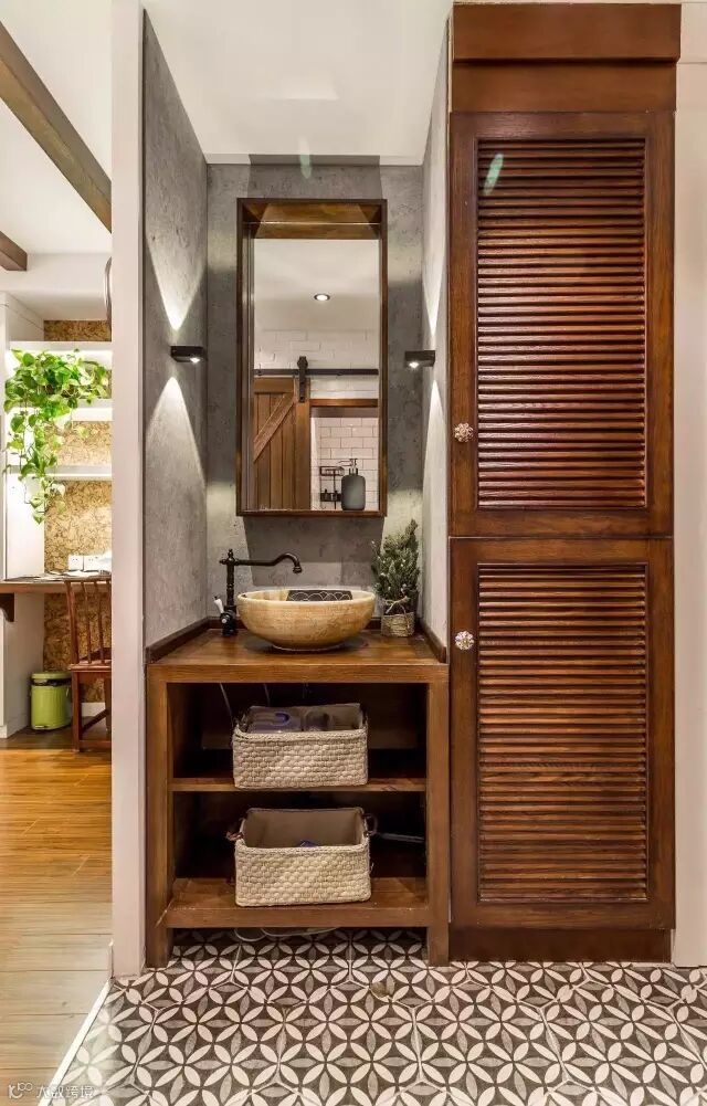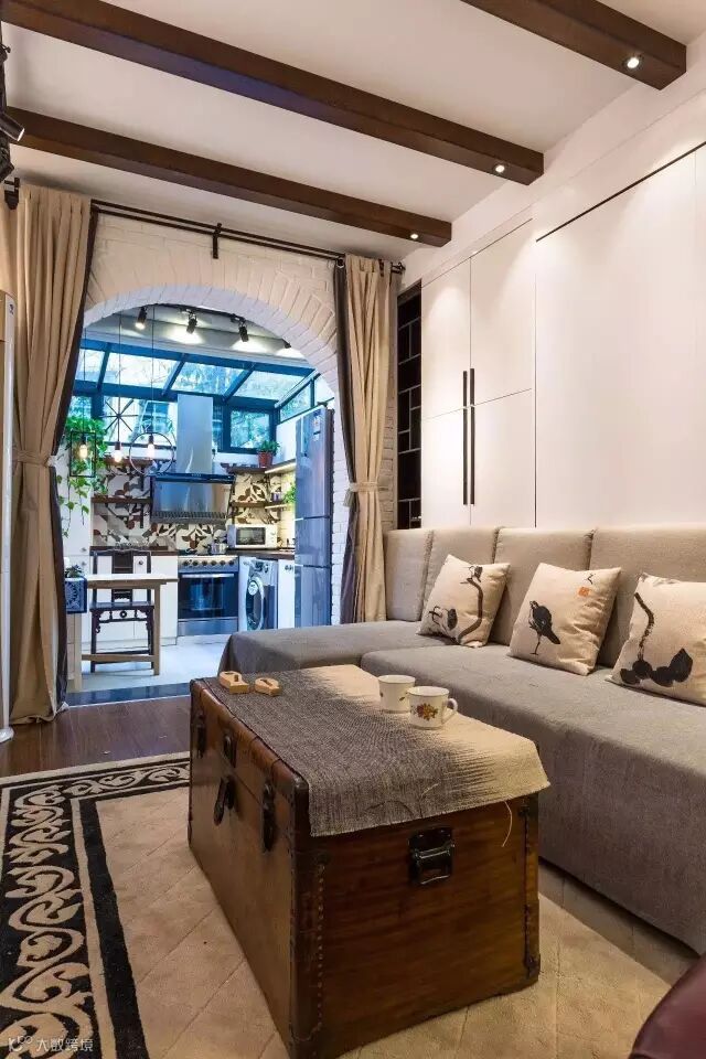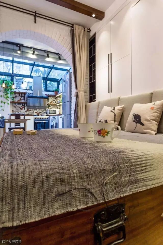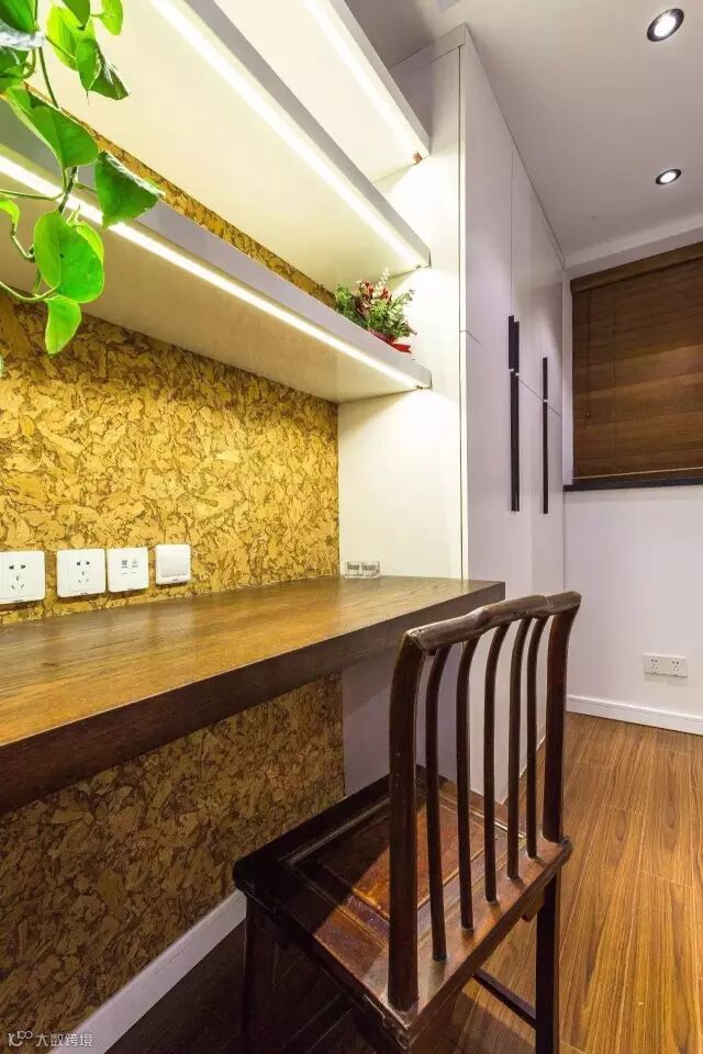 1、原来的厨房与卧室之间的墙拆了,打通的空间设计了玄关+洗手台+衣帽间+书房+客厅/卧室;