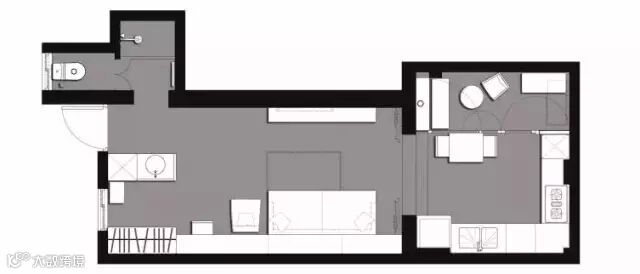 从图上看,整个空间是一个细长条,进门右边是厨房,左边是卫生间,然后往里走是卧室,然后是露台以及在露台上搭建的小黑屋。