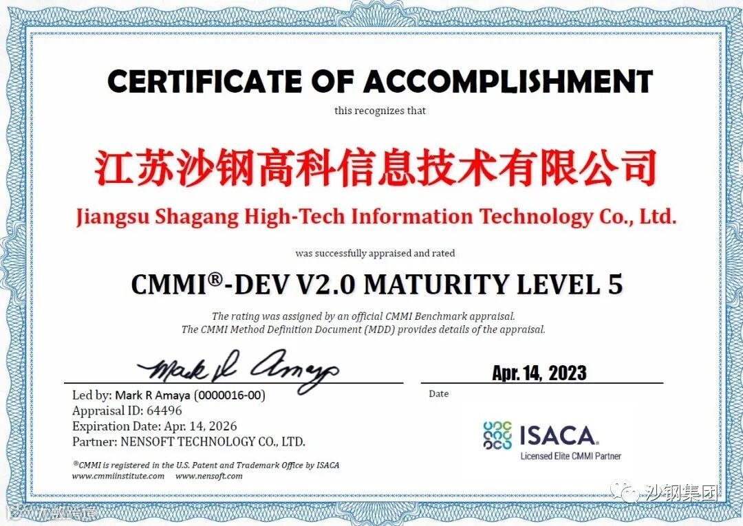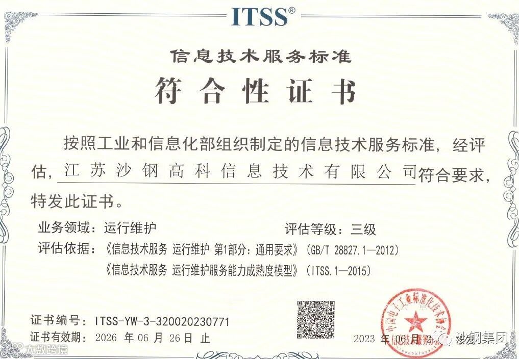 7月18日,沙钢高科收到中国电子工业标准技术协会信息技术服务分会颁发的ITSS 3级认证证书,标志着沙钢高科运维服务能力和服务标准化体系建设获得认可,这也是继CMMI5国际权威机构资质认证后,沙钢高科获得的又一项权威机构资质认证。