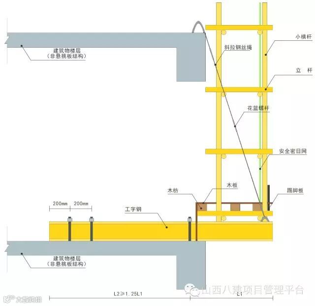 4、工字钢、锚固螺杆、斜拉钢丝绳具体规格、型号依据设计方案计算书确定;