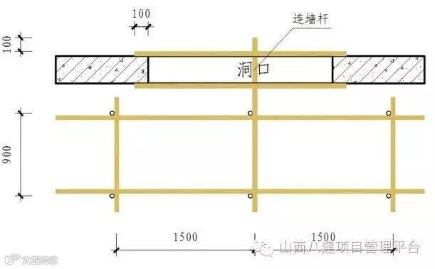 2、在预留孔中穿2根Φ48.3*3.6mm钢管,钢管外端用钢管扣件连接固定,以防滑脱;