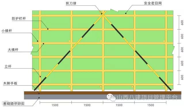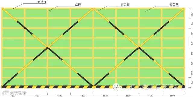 4、脚手架外侧满挂密目安全网,脚手架外挂立杆表面刷黄色油漆,每隔一组或两组剪刀撑设置一道200mm踢脚板,固定在立杆外侧,踢脚板表面刷黄黑警示色油漆;