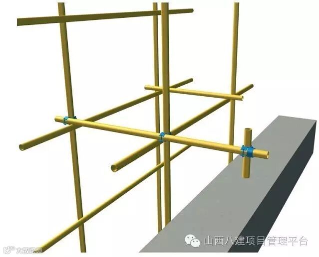 5、主节点必须设置一道横向水平杆,用直角扣件扣接且严禁拆除;