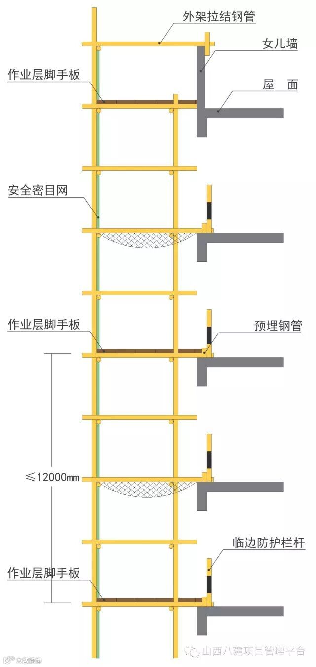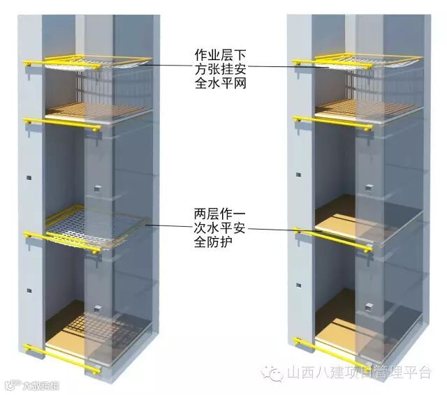2、从第二层起,应每隔12mm设置一道硬质隔断防护,并在其中间部位张挂水平安全网;