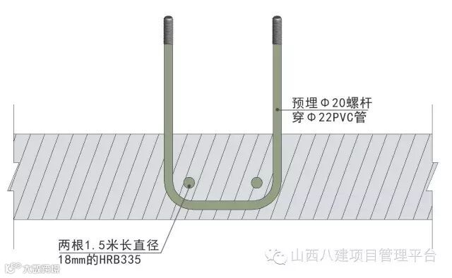 3、楼层预埋Φ20U型螺杆,每道钢梁设置Φ16钢丝绳作为保险绳;