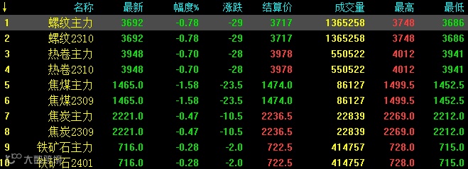 8日螺纹钢主力跌29,收报3692,跌幅0.78%;热卷主力跌28,收报3948,跌0.7%;焦煤主力跌23.5,收报1465,跌幅1.58%;焦炭主力跌10.5,收报2221,跌幅0.47%;铁矿石跌2,收报716,跌幅0.28%。