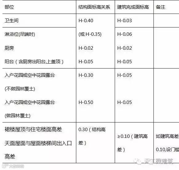 (3) 表一:厨房、卫生间、阳台、露台等的结构面标高及建筑完成面标高关系: