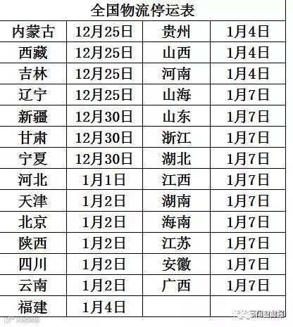 近日,物流部门发布了河北、山东、江苏、湖北、湖南、上海、安徽、内蒙古等27个省份地区春节期间物流停运通知。各地自12月25日起就陆续停运了,需要备货的请趁早!
