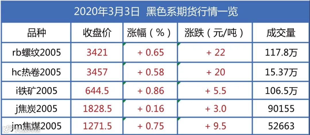 3月3日,国内商品期市多数收涨,能化品涨幅居前,螺纹涨0.65%至3421,热卷涨0.58%至3457,铁矿涨0.86%至644.5,焦炭涨0.16%至1828.5,焦煤涨0.75%至1271.5,敬请看下图: