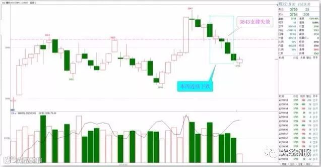 上周期钢价格呈现连续下跌之势。周一开盘价于3893元/吨,周五下午收盘于3750元/吨,每吨下跌143元。由于上周上涨势头强劲,市场普遍预期在3840元/吨的位置能遇到有效支撑,但实际情况并非如此,在3840的心理支撑位置,多头只是略微做了一下抵抗,就被空头消灭殆尽,出现三连阴走势。