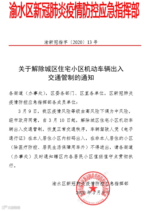 3月9日,我区疫情风险等级由高风险下调为中风险,经市政府同意,自3月10日起,解除城区住宅小区机动车辆出入交通管制,恢复正常交通秩序,车辆驾驶人凭《电子通行证》在本人居住小区内扫码出入,在非本人居住的小区(除医疗防控、居民生活保障用车外)不得进出,请各街道(办事处)及时通知辖区内各居民小区值班值守点贯彻执行。