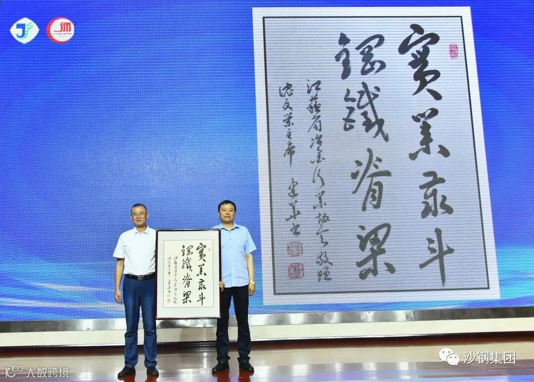 江苏省冶金行业协会会长陈建华向江苏省冶金行业协会名誉会长沈文荣赠予“实业泰斗 钢铁脊梁”牌匾,沙钢集团股东委员会顾问高永生代受赠。