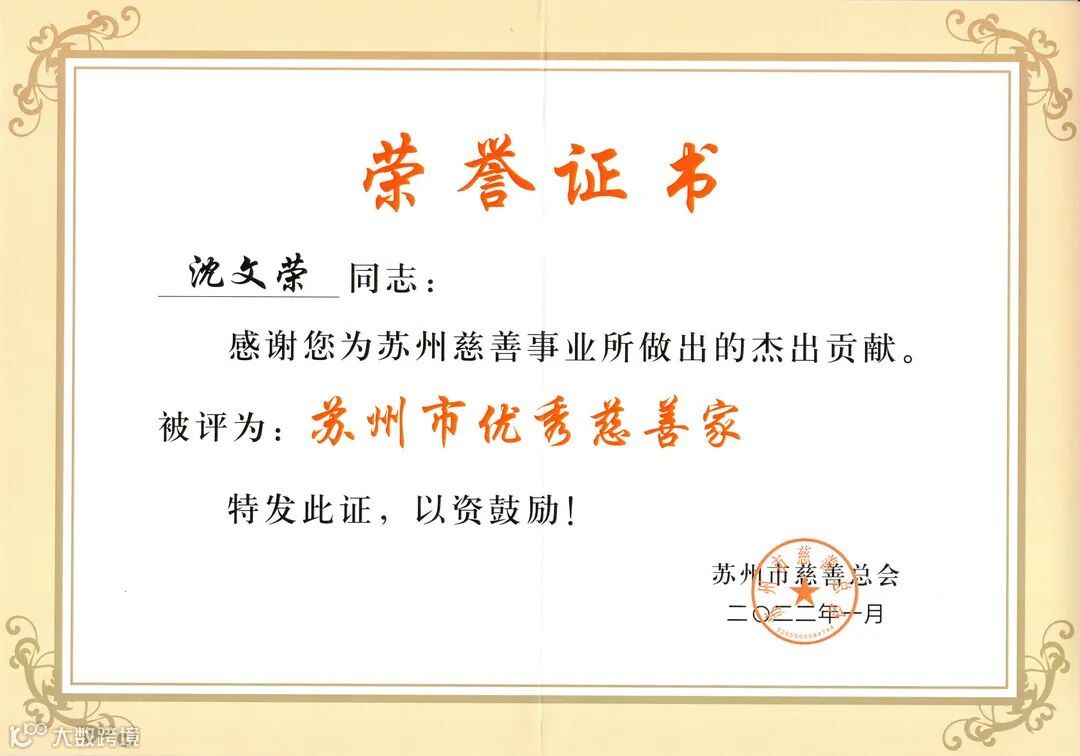 1月16日,“文明苏州 向上向善”——2022年苏州市新年慈善晚会隆重举行。晚会表彰了一批先进单位和个人,沙钢集团董事局主席沈文荣荣膺“苏州市优秀慈善家”。