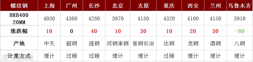 今日国内建筑钢材价格小幅上涨。具体价格来看,全国25个主要城市均价4160元/吨,较上一交易日价格上涨14元/吨,其中济南地区价格上涨60元/吨,涨幅最大;其余地区涨幅在10-40元/吨不等;仅南昌、乌鲁木齐地区受心态影响,价格出现下跌。具体来看,虽市场整体交投氛围热情不足,但在库存压力较小的和偏高成本的情况下,商家挺价意愿十分明显,其中比较明显的是西南和华东地区市场其库存相对较低。可以看出目前市场处在被动去库阶段,目前在库存和成本支撑下动力偏强,因此预计明日市场价格将呈震荡偏高趋势运行。