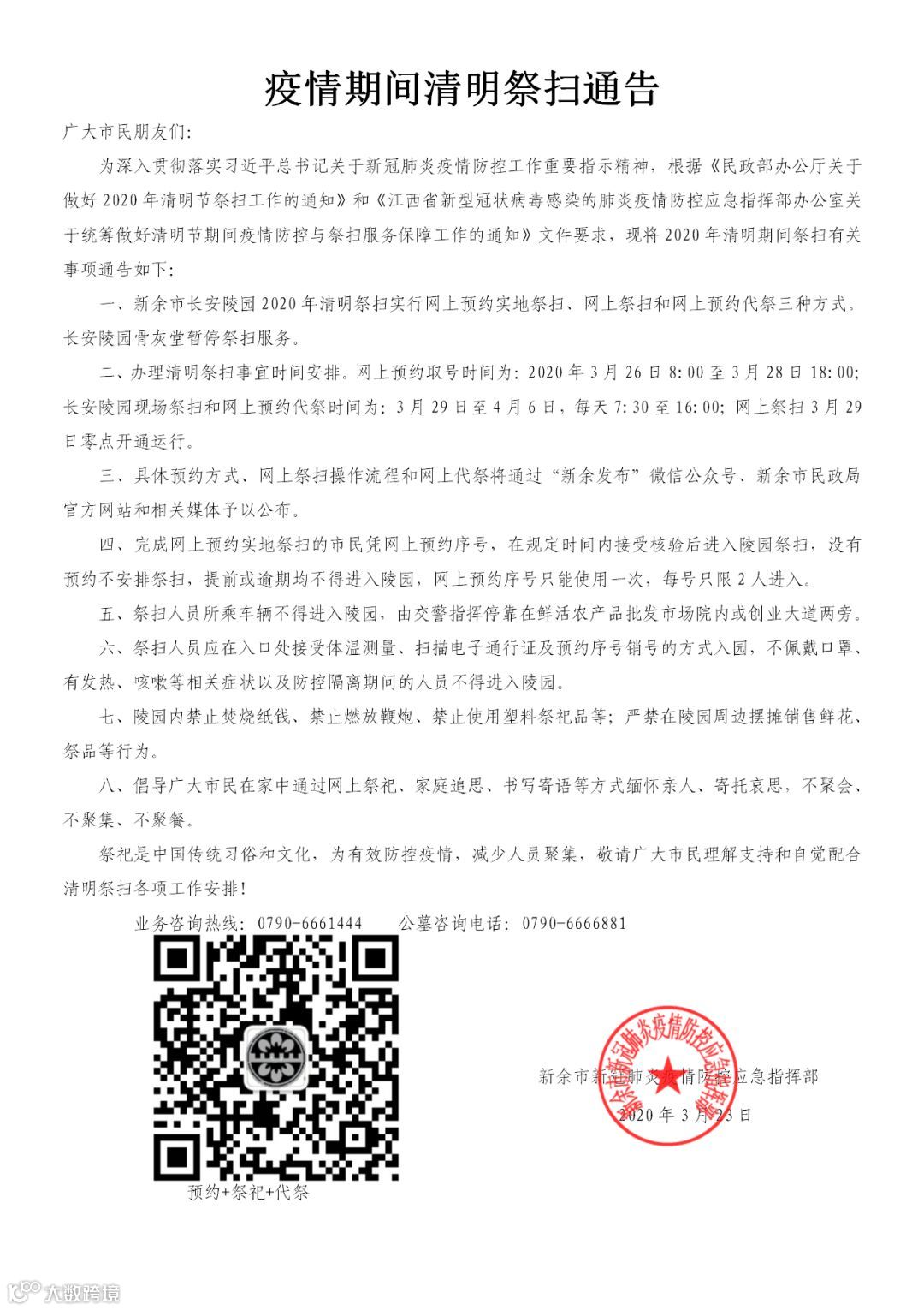 为深入贯彻落实习近平总书记关于新冠肺炎疫情防控工作重要指示精神,根据《民政部办公厅关于做好2020年清明节祭扫工作的通知》和《江西省新型冠状病毒感染的肺炎疫情防控应急指挥部办公室关于统筹做好清明节期间疫情防控与祭扫服务保障工作的通知》文件要求,现将2020年清明期间祭扫有关事项通告如下: