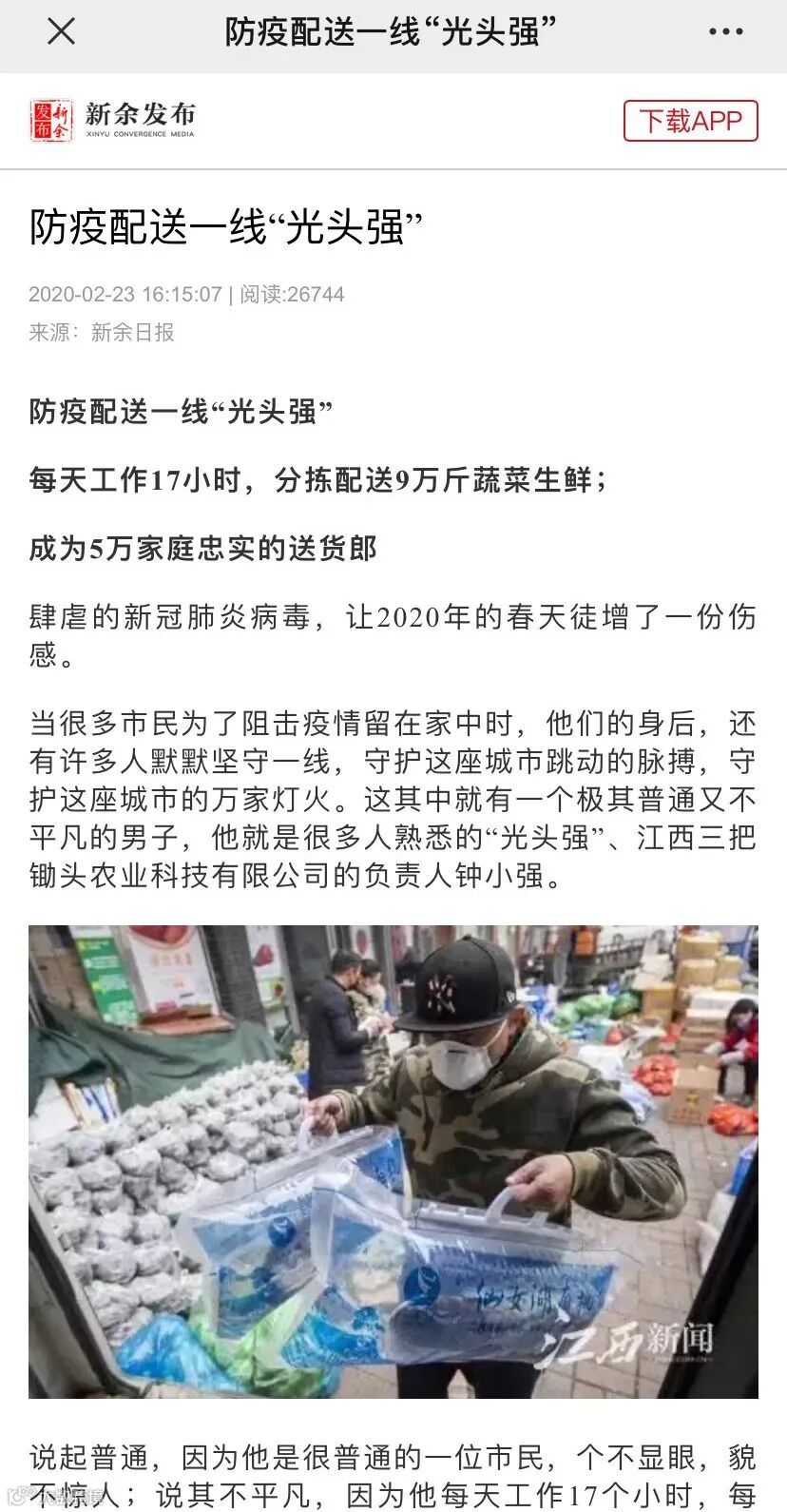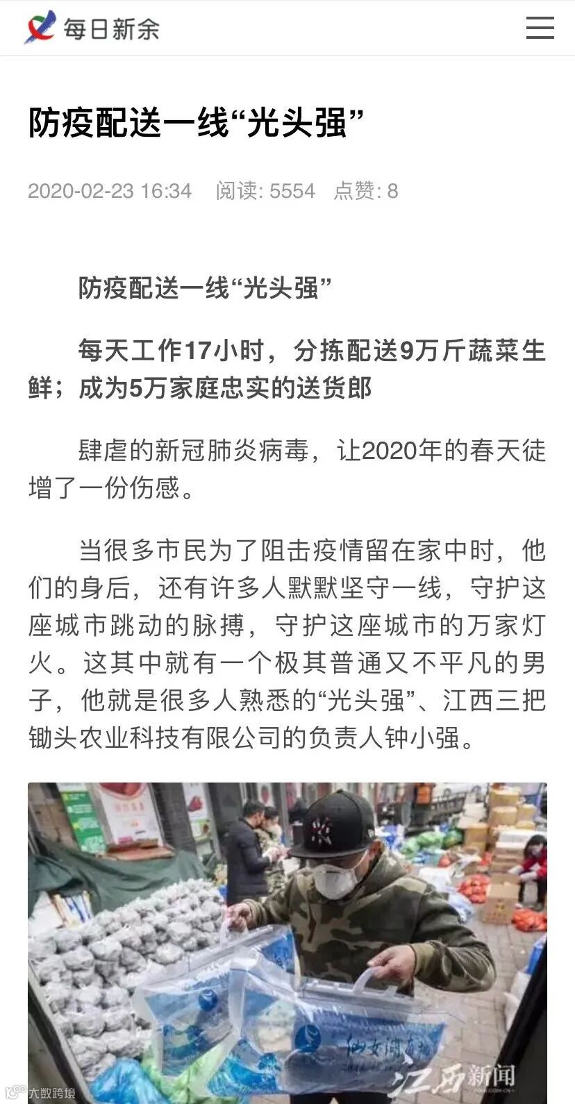 当很多市民为了阻击疫情留在家中时,他们的身后,还有许多人默默坚守一线,守护这座城市跳动的脉搏,守护这座城市的万家灯火。这其中就有一个极其普通又不平凡的男子,他就是很多人熟悉的“光头强”、江西三把锄头农业科技有限公司的负责人钟小强。